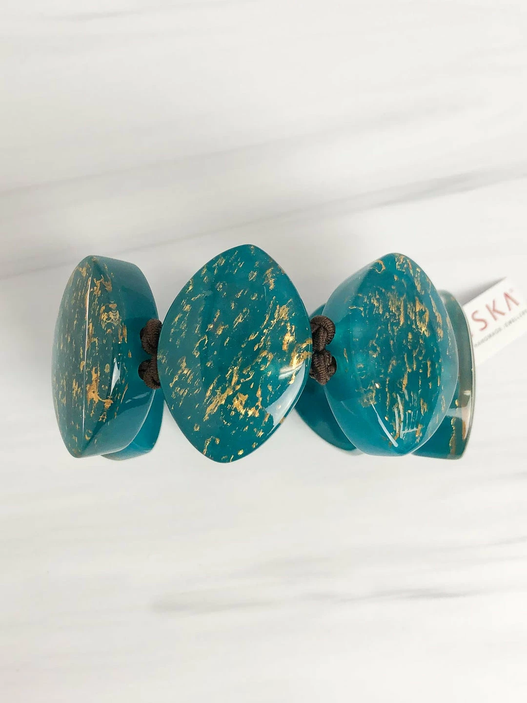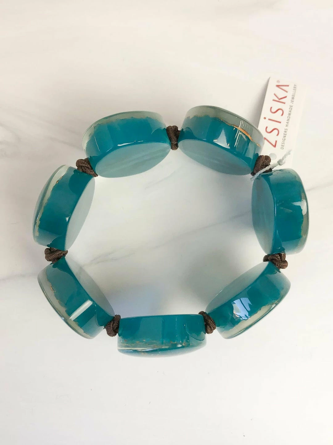 Zsiska’s “Rhea” collection features layered resin with textured gold accent. This stretch bracelet features almond shaped pieces on coordinating knotted elastic cord.
