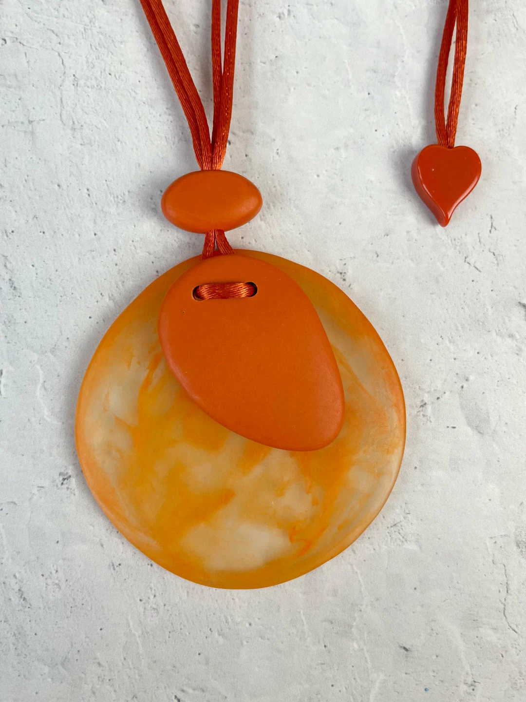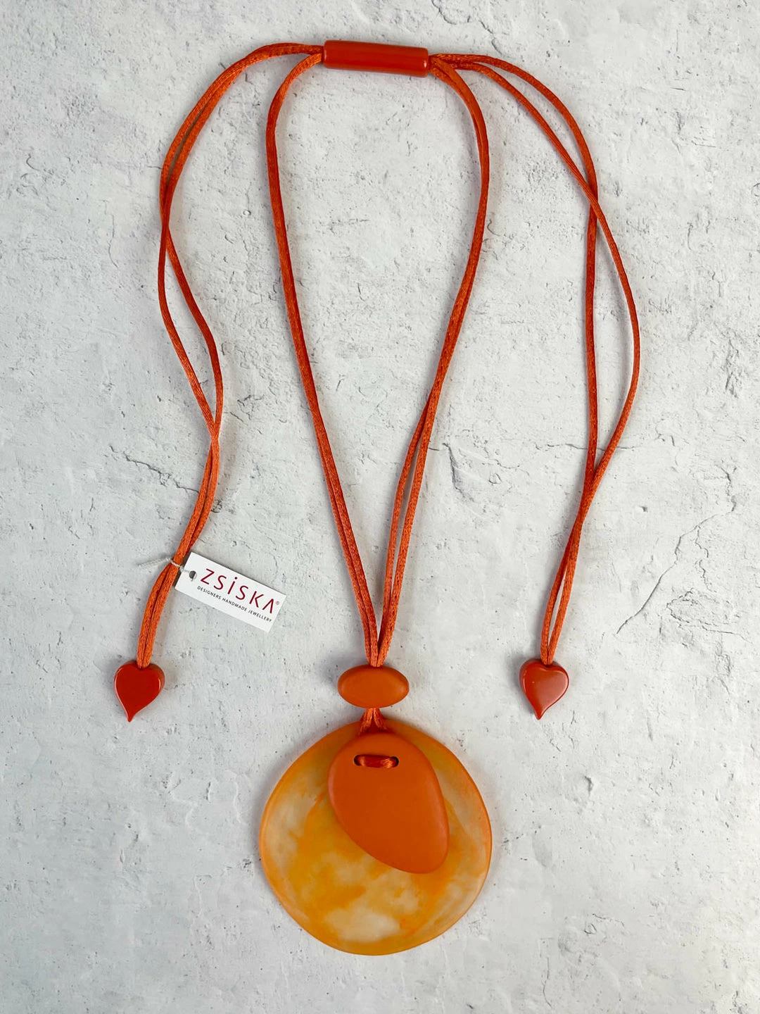 Zsiska’s “Sabaai” collection features a sophisticated mix of translucent marbled resin with coordinginat solid resin, both with a soft matte finish. This adjustable necklace features a pendant of three pebbled beads knotted on fabric cord, with adjustable pulls.