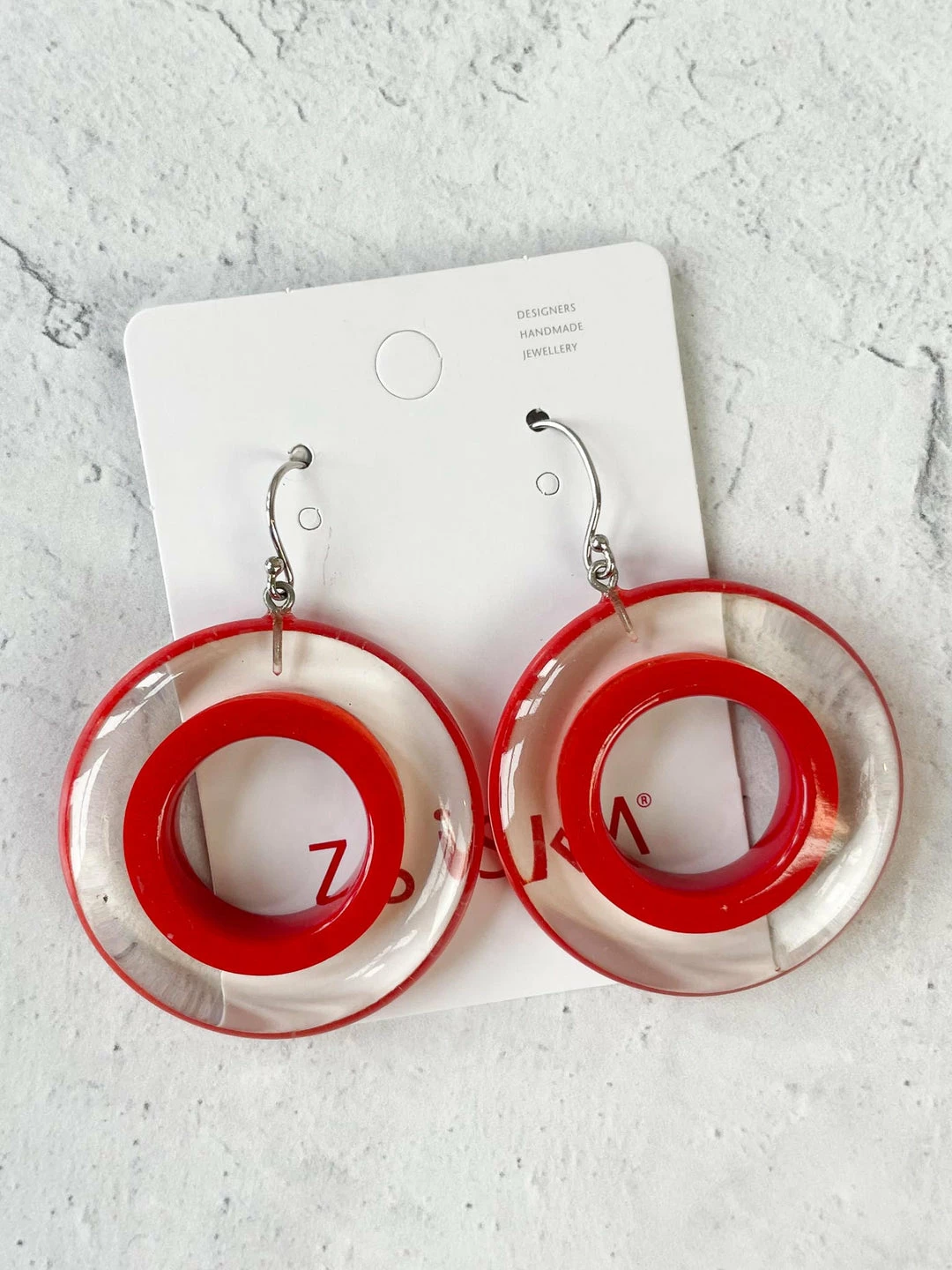 The “Vida” styles from Zsiska make up a mini capsule featuring shiny clear resin discs with a vibrant ring of accent color. These earrings show off such a drop on fish hook ear wires.