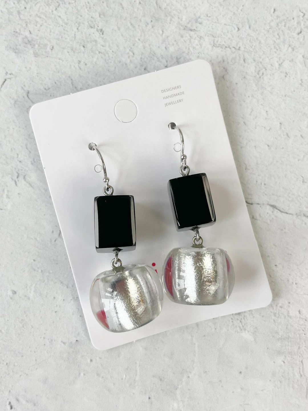 From Zsiska’s “Precious” collection, these earrings feature a mix of rounded precious metal foiled resin beads and black cube resin beads hanging from french hook ear wires.