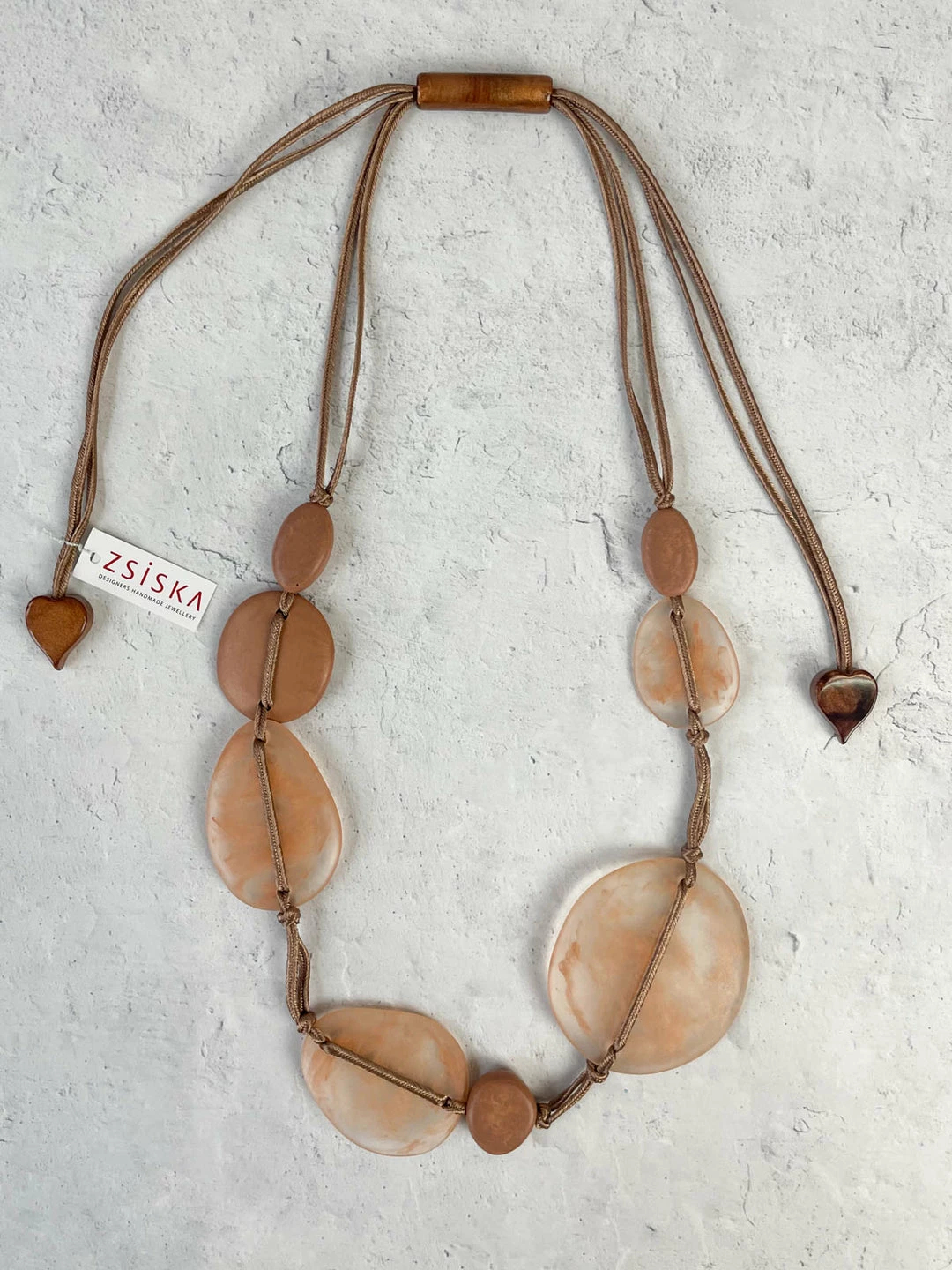 Zsiska’s “Sabaai” collection features a sophisticated mix of translucent marbled resin with coordinginat solid resin, both with a soft matte finish. This adjustable necklace features eight pebbled beads knotted on fabric cord, with adjustable pulls.